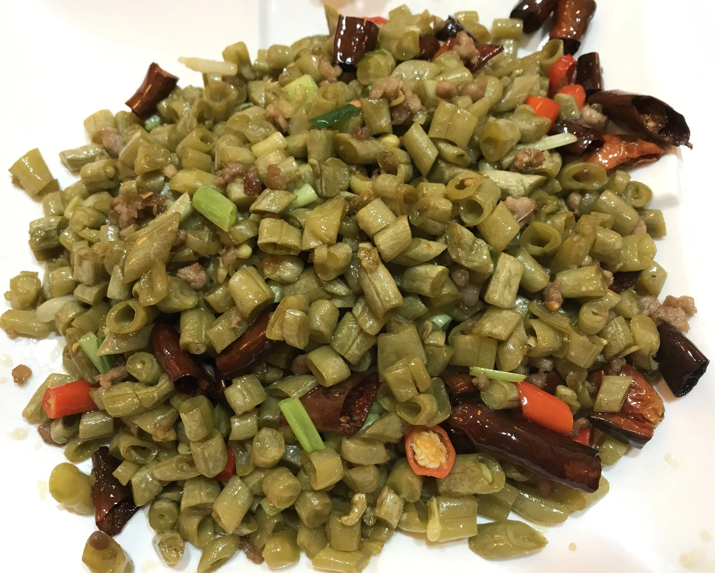 Sour beans with pork. Long beans, chopped into short segments, pickled you think, served with ground pork. Scrumptious. Startling in its uniqueness.