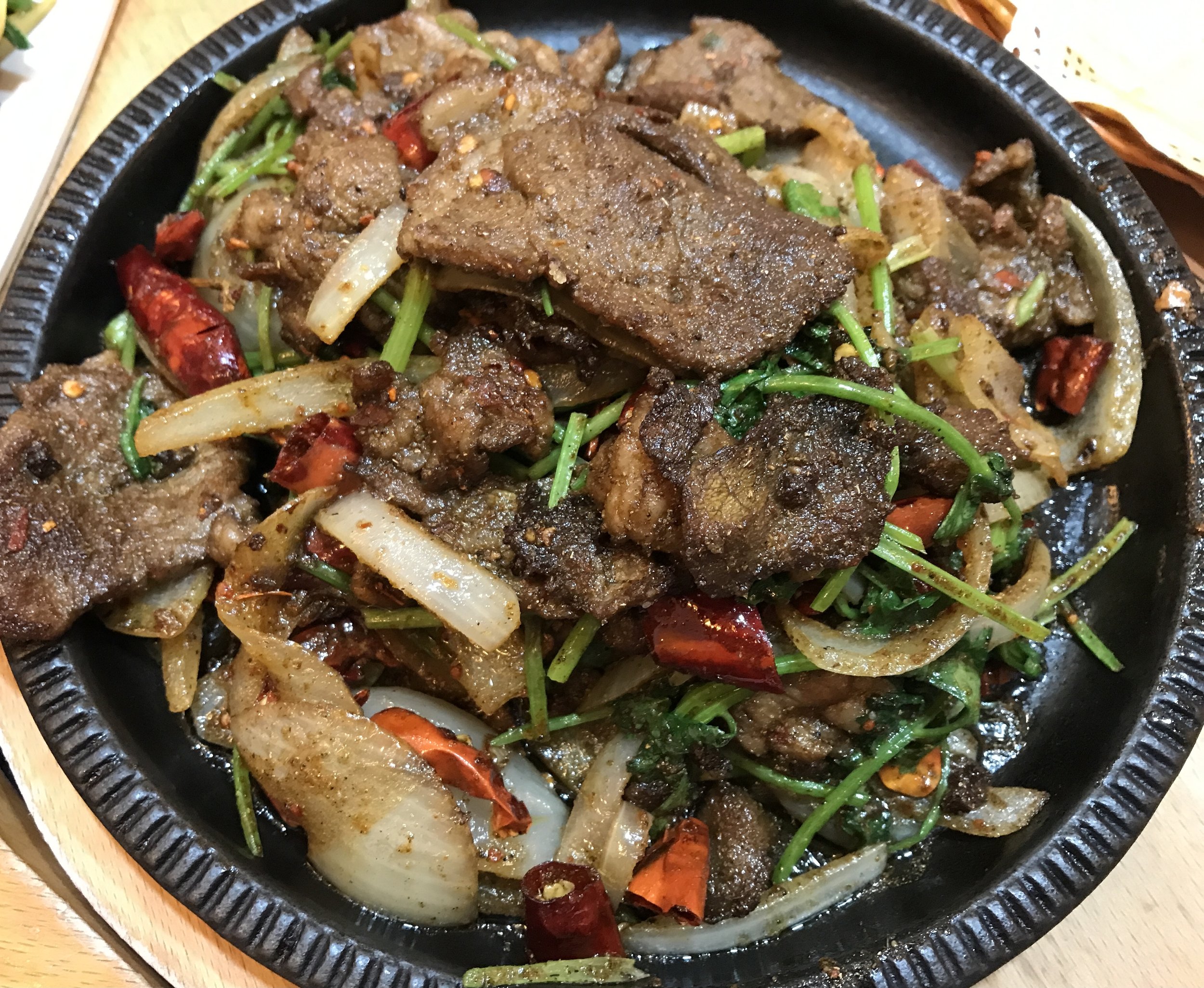 Sizzling lamb. Thin sliced lamb with cumin. Crazy good.