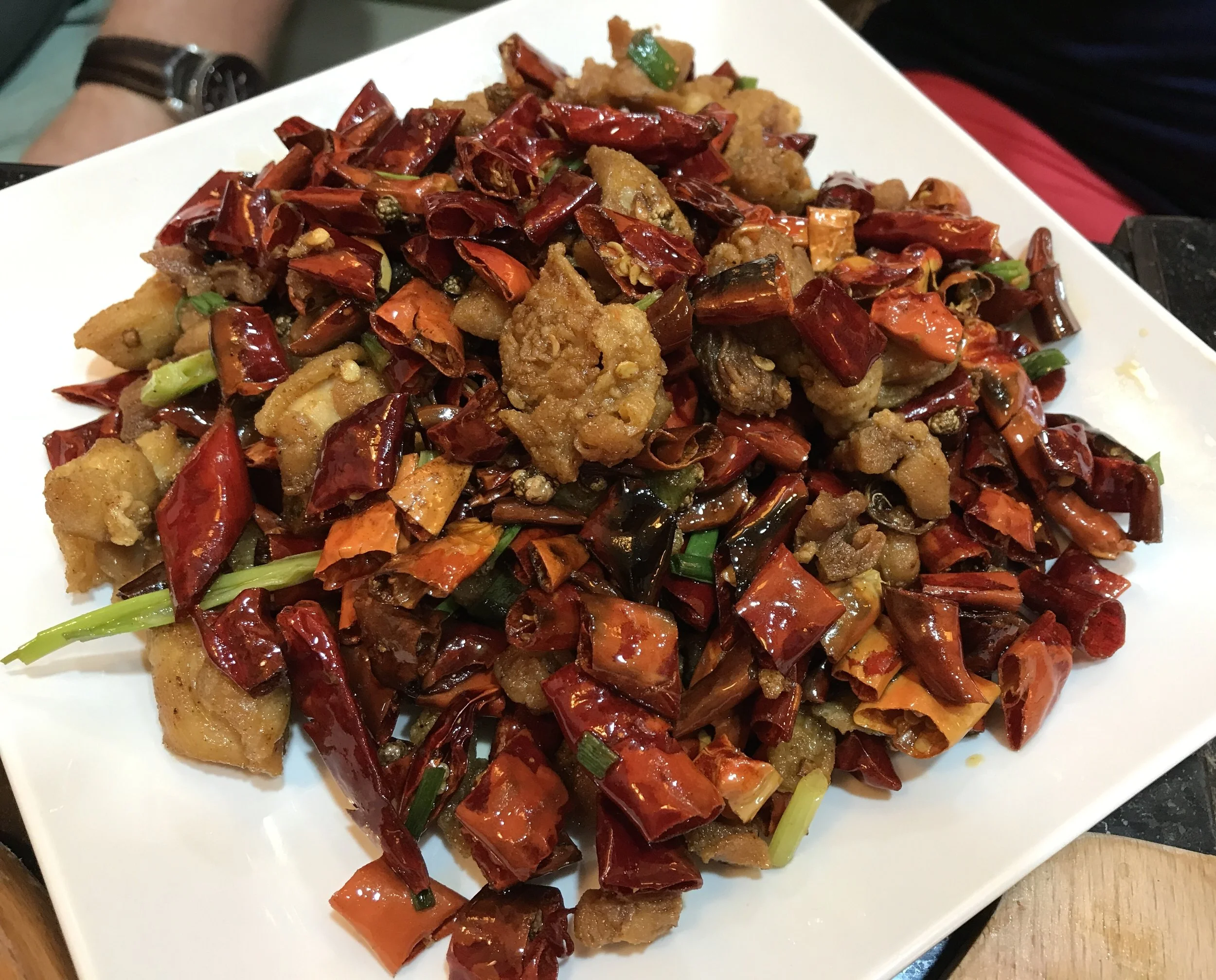 Deep fried boneless chicken chunks with lots of dried peppers. You wish it had contained peanuts or cashews and cloves of garlic and scallions. But this is one of the better versions of this dish you’ve had, rich in Szechuan peppercorns that brought a delightful citrus element. Very good, but shy of excellent.